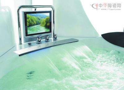 者介紹一款浴缸,該浴缸除具有水流按摩、沖浪等功能外,還裝有9英寸的防水液晶顯示器,這樣在洗浴時就能看電視、DVD,還能聽CD和立體聲調(diào)頻廣播。同時,它還有泡泡浴、恒溫控制、臭氧殺菌、管道清洗等多種先進功能。據(jù)銷售人員說,這款產(chǎn)品以往只做外銷,近幾年才開始接受國內(nèi)顧客預(yù)訂,價格在4萬元左右。