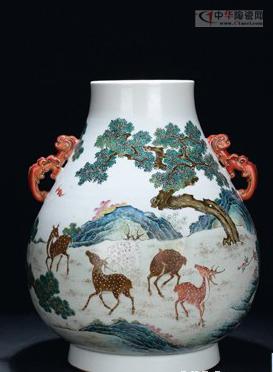 在明清瓷器專題中,“清乾隆 粉彩螭龍耳福祿尊”(高44.5cm)備受矚目。此件拍品曾于北京翰海以過千萬元的價格成交。器形雍容大氣,圓口,器形以下漸廣,垂腹,圈足,肩部飾雙螭龍耳,胎體厚重,釉面潔凈,造型端莊。腹部滿繪粉彩福祿圖,五色神鹿形態(tài)各異,且此風(fēng)格粉彩十鹿較之傳統(tǒng)畫面百鹿尊的流傳廖若星辰,傳是甚為稀少。最終,在幾番競價之后,該福祿尊最終以2875萬元的價格成交,同時也成為該專場拍賣成交價格最高的拍品。