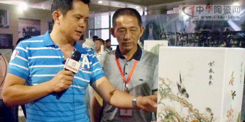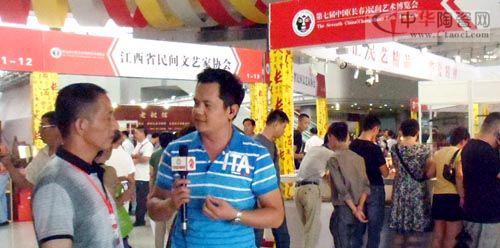 景德鎮(zhèn)陶藝大師席新明在民博會(huì)上向電視媒體介紹景德鎮(zhèn)陶瓷文化