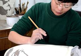 范雙梅正凝神創(chuàng)作,用特制的雞頭毛筆進(jìn)行青花分水。
