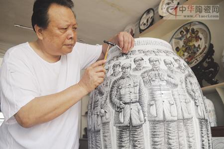 此瓶為白瓷,高80厘米、最大直徑63厘米、瓶口42厘米,利用刻瓷獨有的手法,展現(xiàn)了87名中國共產(chǎn)黨成立以來的歷史人物,選材廣泛,題材重大,雕刻達到1700多萬刀,在全國陶瓷界實屬罕見,具有極高的收藏價值和藝術(shù)價值。圖為閆先公正在對大型刻瓷瓶《領(lǐng)袖與將帥》進行最后的修正。