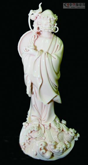 《一葦渡江》,又名菩提達(dá)摩,是德化著名瓷雕藝術(shù)家陳其泰(1915-1995年)于上世紀(jì)80年代初創(chuàng)作的杰作。菩提達(dá)摩,意譯為覺法,于南朝梁武帝時期自印度航海到廣州,至南朝都城建業(yè)會梁武帝,面談不契,遂一葦渡江,北上少林寺,面壁九年,成為中國禪宗的始祖,被尊稱為“東土第一代祖師”。達(dá)摩的事跡隨著禪宗的發(fā)展,漸趨神異,并成為中國畫家、瓷藝家所愛的題材,明清德化窯達(dá)摩瓷塑就常以此為題材。陳其泰的渡江達(dá)摩神情威嚴(yán)而含蓄,身材偉岸,禪仗橫肩,左手輕托法水,赤足立于波濤之上,飄然過江,作品的衣紋線條雖簡,但流暢柔美,非常有概括力,人物形象神采畢現(xiàn),極具藝術(shù)美感。