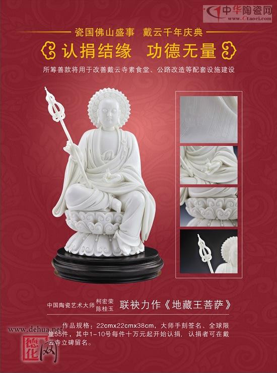 中國陶瓷藝術(shù)大師柯宏榮、陳桂玉再獻(xiàn)愛心,為戴云寺千年慶典聯(lián)袂力作《地藏王菩薩》,手刻簽名、全球限量55件,其中1-10號每件十萬元起開始認(rèn)捐,認(rèn)捐者可在戴云寺立碑留名。所籌善款將用于改善戴云寺素食堂、公路改造等配套設(shè)施建設(shè)。