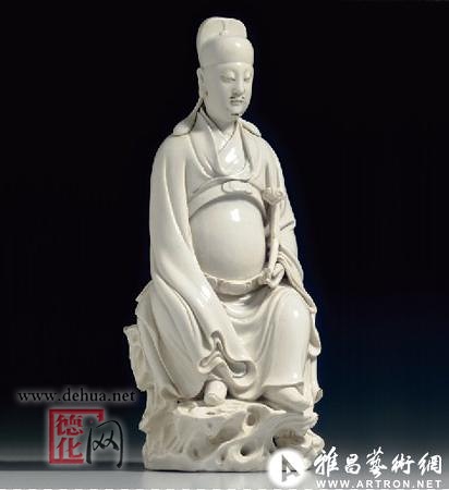 檢查十五年來國際拍賣市場中,德化白瓷每年的主要成交記錄,可以清楚地看出價格變動的曲線和不同器型的價格差。這是一份很有意思的資料,1997年3月紐約蘇富比‘清中期18世紀渡海觀音立像“(H:50.8)成交價29,900美元;12月倫敦佳士得“清中期18世紀如意觀音坐像”(有印章)成交價19,550英鎊;9月紐約蘇富比“清中期18世紀持經(jīng)觀音立像”成交價16,000美元;4月北京嘉德“清17世紀丁水奇珍印章獅耳香爐”(明晚期印文山水珍藏)成交價11,000元人民幣。