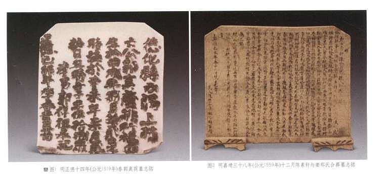 明嘉靖三十八年(1559年)十二月陳素軒與妻鄭氏合葬墓志銘(圖2)瓷板橫式方形,上額兩旁作斜角,下端左右附貼有凸出板平面的呈橫式雙拱形的承托底座。高17.5厘米,寬22厘米,厚0.5厘米。胎骨質(zhì)堅(jiān)細(xì)膩,俗話稱糯米胎。釉面肥厚滋潤,胎釉中閃淺肉紅色。釉面有脫釉。款字青料色澤呈現(xiàn)藍(lán)中微泛紫的濃重,但字跡清晰。書寫有“殿士素軒陳公與節(jié)孺人鄭墓……嘉靖己未年冬十二月口日之吉”等共484字,記錄了死者的生平事跡。據(jù)墓志銘中記載,志主陳素軒先于其妻鄭氏謝世,時鄭氏年未滿30歲。嘉靖三十七年(1558年)冬十一月初六日鄭氏卒,翌年十二月廿九日合葬于陳素軒之右。墓志銘則為鄭氏入葬時制。