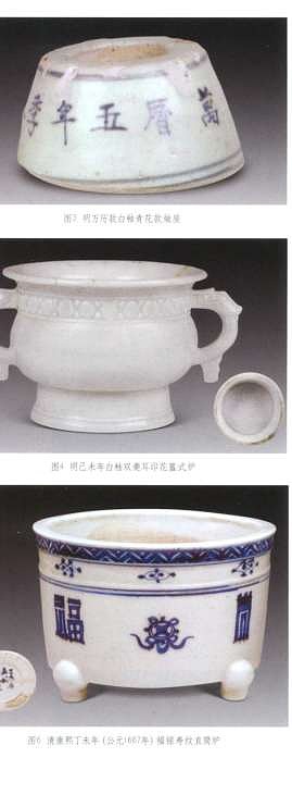 紀(jì)年款是標(biāo)明瓷器制作年代的一種款識,在款識中占有較大比例,可分為三種:第一種為年款,即以帝王年號為紀(jì)年的款識,也稱朝代款,如“大明宣德年制”等;第二種為干支款,即用天干配地支來標(biāo)明器物具體年份,如“大清康熙丙午年制”等;第三種為不書具體年代的款識,如“大明年造”、“大清年制”等,多用于民窯。字體有楷、篆、行草等,排列方式有橫書、豎書,三行、二行、一行不等。用料有青花、彩繪等。明清官窯紀(jì)年款書寫規(guī)范,而民窯則為隨意,這也是判斷官、民窯器物的標(biāo)準(zhǔn)之一。隨著德化窯研究與考古工作的不斷深入,一些珍藏的紀(jì)年器不斷面世,它們代表著不同時期的時代特征,為德化窯瓷的鑒賞提供了重要的參考信息。下面介紹幾件德化窯具有代表性的紀(jì)年器: