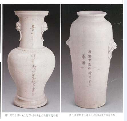 明天啟四年(1624年)白釉鋪首銜環(huán)瓶(圖5)撇口,溜肩,鼓腹,平底略帶圈足,瓶的頸部兩側(cè)附貼對稱的獅首銜環(huán)。乳白釉色的瓶體豎寫青花銘款“時明朝天啟肆年歲次甲子秋吉賽謝”15字。青花色呈藍(lán)中帶灰,白胎瓷化較好。