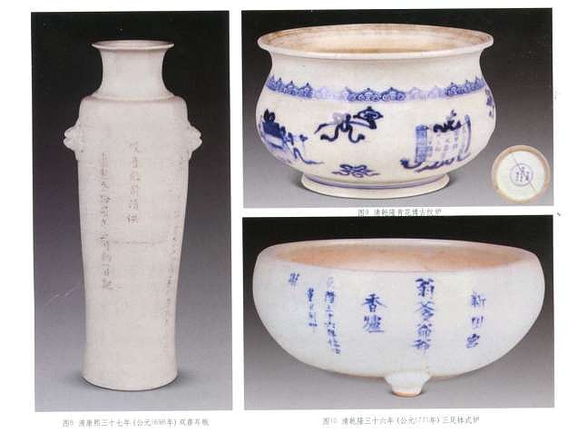 清康熙丁未年(1667年)福祿壽紋直筒爐(圖6)高14厘米,口徑20厘米。手拉坯成型,器呈圓口,爐身作筒狀,底接實(shí)心三足。爐底書寫“丁未年孟秋奎山置”青花款。
