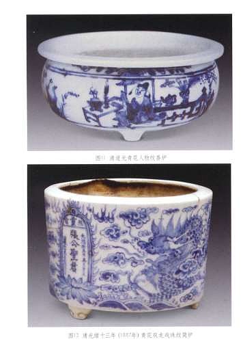 清道光青花人物紋香爐(圖11)高9厘米,口徑12厘米。爐底書寫“招財(cái)進(jìn)寶大清道光十年德美堂置墨”款。此爐胎釉瑩潤,白中泛青色,青花色呈藍(lán)中帶青。