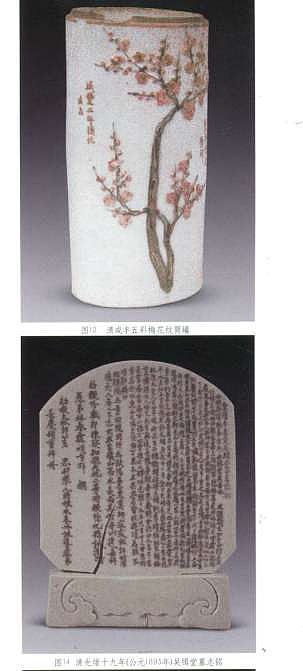 清光緒十九年(1893年)昊緝堂墓志銘(圖14)墓志分為文字板和底座兩部分,瓷板近長方形,上額微拱圓形,下端兩旁作斜角。板中部最高處為24.7厘米,兩旁高分別14.5和15厘米,面寬20厘米。板面書寫青花“皇清奉直大夫吳緝堂公墓志……”等共512字銘文。底座呈橫式扁方形,中部內(nèi)凹可供瓷板豎立。底座正面刻劃簡單的“蝠”形圖案,寓意“福”。白釉微泛黃,青料色調(diào)泛黑。根據(jù)銘文記載,吳緝堂生于清嘉慶二十二年,卒于光緒十六年(1816-1890年),葬于光緒十九年(1893年),墓志銘為安葬時所立。