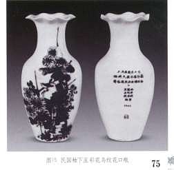 民國釉下五彩花鳥紋花口瓶(圖15)高26厘米,口徑10厘米。瓶口有如開放的花瓣,頸部微撇,圓腹,整體以變化的弧線構(gòu)成柔和勻稱的瓶體。器物背腹壁書寫“一九四三年……”等字款,底有“許光月制”四方形印章。許光月(1906-1984年),福建省德化縣城關(guān)湖前人,又名文照,別號漁父。一生從事陶瓷60余年,是將瓷彩、造型設(shè)計(jì)、釉料配方等集于一身的民間知名藝人。