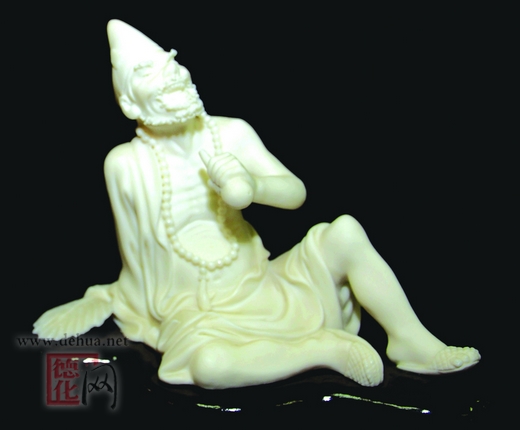 《濟(jì)公》是著名陶瓷工藝美術(shù)師許金盾(1937-1999)的遺作。許金盾少年從父許光寶學(xué)藝,1956年進(jìn)德化瓷廠師從雕塑名家蘇勤明,1958年又被選送福建省工藝美術(shù)學(xué)校進(jìn)修,,學(xué)成后有件瓷雕作品獲國家獎。許金盾的濟(jì)公,斜坐于西湖邊,左手持破扇于地,袒膊的右手握住酒壺嘴,那看破凡塵的仰天大笑幽默詼諧,富有情趣,作品形象生動,線條有韻律感,工藝精巧,足見其雕塑功底之深厚。