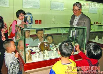 圖為頤陶軒負(fù)責(zé)人在向小朋友講述展廳中古陶瓷的故事。