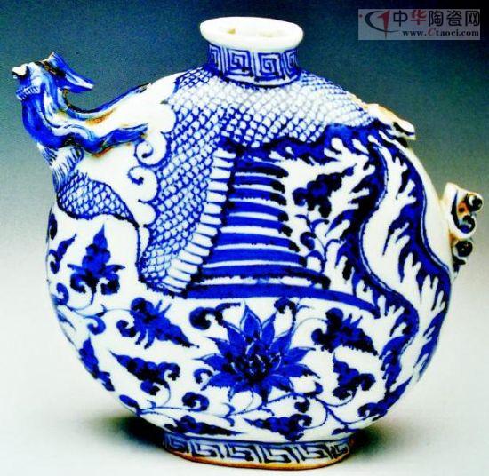 元代青花鳳首扁壺。追溯中國近代歷史,元代的中國海外貿(mào)易比較繁榮,大量的中國青花瓷器被運(yùn)輸?shù)搅酥袞|地區(qū),尤其是景德鎮(zhèn)燒制的青花瓷器,胎體潔白、釉色純凈、青花色澤濃艷青翠,漂亮無比,非常受當(dāng)?shù)鼐用竦南矚g。