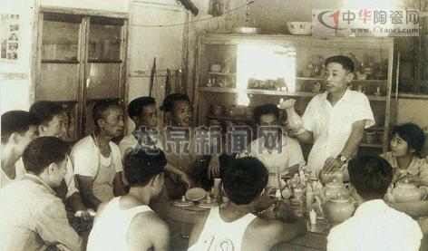 銷路問題解決了,隨著新廠成立而來的難題也被一個個攻克了。賴自強帶領技術骨干進行青瓷胎釉、造型和生產工藝試驗。廠里的工人們經常圍著賴自強討教青瓷方面的問題,照片正是拍于那個時候。