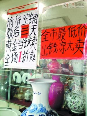 濱江東路一家景德鎮(zhèn)瓷器展銷(xiāo)會(huì)打出清貨甩賣(mài)廣告。