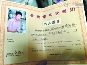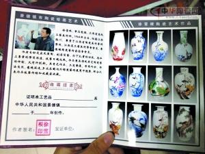 在濱江東路一家景德鎮(zhèn)瓷器展銷(xiāo)會(huì)店鋪,只見(jiàn)一個(gè)青瓷花瓶旁放著一份封皮皺皺巴巴的“收藏證書(shū)”。記者發(fā)現(xiàn),這些證書(shū)印刷粗糙,多為相紙打印。證書(shū)左側(cè)一般印著“名家”簡(jiǎn)介,右側(cè)則是一幅或多幅瓷器作品的照片。記者在網(wǎng)上搜索,發(fā)現(xiàn)一些作品確實(shí)能與這些名家的作品相對(duì)應(yīng),但卻無(wú)法辨別真?zhèn)巍?/p>