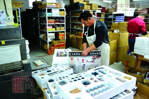 傍晚時分,在“言藝茶具茶品”的倉庫間,工人們緊張忙碌著,為當(dāng)日成交的網(wǎng)絡(luò)訂單包裝發(fā)貨。
