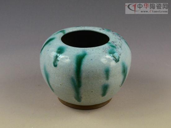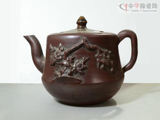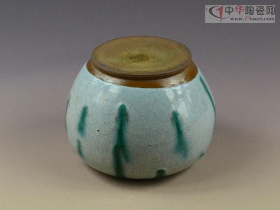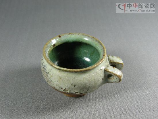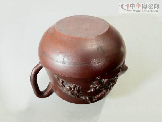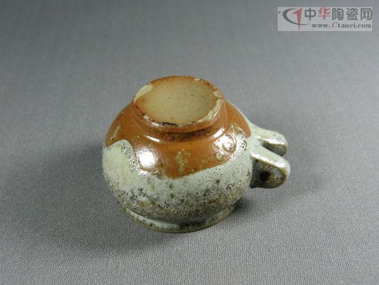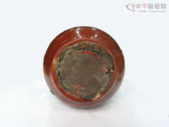 圖2-1宋代榮昌瀝彩壺是成都玉壘山房的藏品,它是榮昌早期的紫砂類陶器作品。我們知道,江蘇宜興用紫砂泥制陶始于宋代,最早有確切年代的器物,就是南京中華門外馬家山油坊橋明嘉靖司禮太監(jiān)吳經(jīng)墓出土的紫砂提梁壺,墓志標明入葬于嘉靖十二年,即公元1533年。這把榮昌泥制瀝彩壺的器形,具有明顯的五代至北宋時期的巴蜀古陶瓷特征,它是榮昌陶器具有千年歷史的物證。它的胎體由紅泥制作,它肩部兩側(cè)的花卉圖紋用白泥漿瀝彩而成,花簇繁茂而靈動。它是一把執(zhí)壺的同時,又是一件難得的藝術(shù)作品,這表明榮昌陶器的制作者從一開始就追求藝術(shù)性與實用性的結(jié)合。圖2-2是它的底部,從圖中可以看出其平底略呈下凹狀,底的這種形態(tài)一直延續(xù)到近代,可以說平底下凹是榮昌陶器的一個特征。圖3-1、圖3-2的貼刻花素燒壺為晚清作品,其蓋為后配。它素胎無釉,跟宜興紫砂相似,其兩側(cè)有貼刻的梅花,美觀大方。圖4-1、圖4-2的朱砂釉膽瓶是典型的清代器物,釉面光亮多變化,含蓄而生動。圖5-1、圖5-2是件清代月白釉綠彩水盂,屬文房用具,文房類是榮昌安富鎮(zhèn)陶器的一大門類。由于榮昌陶泥質(zhì)地細膩,可塑性強,燒結(jié)變形小,非常適合制作小巧玲瓏的薄胎器物,因此有“泥精”之稱。在這件水盂的月白色乳濁釉中飾條與點狀釉下綠彩,看上去大有唐代邛窯遺風,不免引起研究者對巴蜀陶瓷文化的萬千思緒。圖6-1、圖6-2的清代鳥食罐白色胎,外飾乳濁月白釉,內(nèi)飾綠釉,加上火石紅,呈現(xiàn)三種色彩。從唐代到民國,巴蜀古陶瓷鳥食罐甚多,這跟自然條件下的民俗文化有關(guān)。圖7是一對清至民國的尖底鳥食罐,素胎有白泥貼花。用紅白二泥互為裝飾,也是榮昌安富鎮(zhèn)陶器常用的裝飾手法。圖8是清至民國時期的紅丹釉倒流壺,所飾之釉鮮紅光亮,如南紅寶石一般。倒流壺又叫倒注壺、倒灌壺、倒裝壺、內(nèi)管壺等,這一充滿科技與趣味的品種在古代陶瓷中是比較稀少的。這件作品呈桃形,又是喜慶的紅色,真是件不錯的祝壽禮品。圖9是件清至民國的龍紋穿帶扁壺,它應(yīng)是一個便于攜帶的酒壺。雖然它屬于粗陶類品種,但是那只經(jīng)瀝、貼、刻、劃而成的從天而降的黃龍,是多么地剛毅有力,真是一件大寫意佳作。