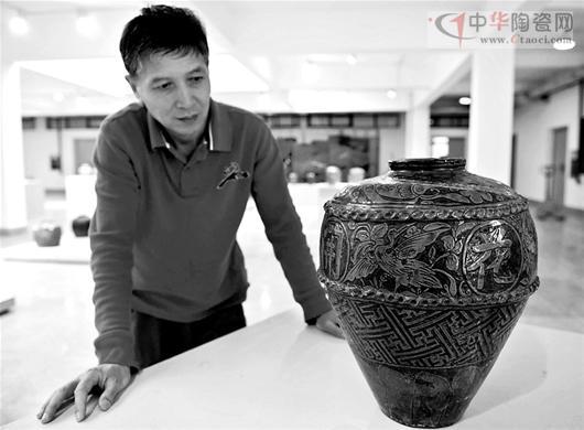 在展廳中,一件做工細致、花紋精美的八仙人物壇,吸引了參觀者的注意。余長庭介紹說,這是一件清代早期的陶器,本是一個裝酒的罐子,他在多年前花4500元買了回來。但這件馬口窯陶器的價值,遠不能以金錢來衡量。