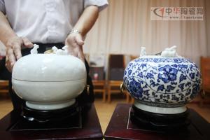 吳館長介紹說:“茶葉罐共有兩款,一款屬于青瓷,一款屬于青花瓷。它是用瓷石和高嶺土等優(yōu)質(zhì)原料,經(jīng)過1200℃-1400℃的高溫燒制而成,每件制作工藝復(fù)雜,不是簡單的復(fù)制古文物,還具有現(xiàn)代的審美觀及實用性,只能限量發(fā)售。而三羊開泰茶葉罐不僅具有極高的觀賞價值,它還是一個儲藏茶葉的容器。