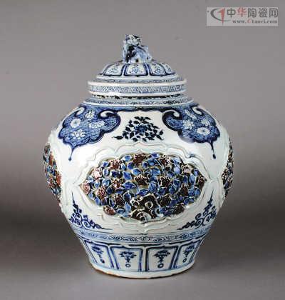 相對(duì)于青花而言,元代青花釉里紅的制作更少,存世就更為罕見。特別是這件蓋罐還采用模印貼花的復(fù)雜工藝,造型厚重典雅,氣勢(shì)宏大;裝飾技法多樣,紋樣繁縟精美,色彩藍(lán)艷含蓄,彩裝飾和胎裝飾技法得到完美的結(jié)合,青花和釉里紅集于一器,白地藍(lán)花與藍(lán)地白花相映成趣;罐腹部開光紋飾采用貼花技法,使器物的平面裝飾又增添了幾分鏤雕藝術(shù)的立體效果,這種集多種裝飾手法于一器的工藝特征,在珍貴的元代青花瓷中也極為少見,當(dāng)為國之瑰寶。