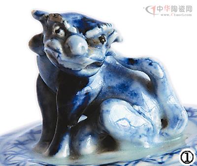 這件蓋罐具有元青花瓷器紋樣多層裝飾帶布局設(shè)計(jì)的典型特征。它通體所繪青花紋飾,紋飾內(nèi)容豐富,層次分明,主題突出,頸部繪青花纏枝菊花紋,肩部飾卷草紋和大朵如意云紋,云頭內(nèi)采用藍(lán)地白花裝飾技法繪水波蓮花,如意云頭之間點(diǎn)綴折枝花卉紋。腹部主題紋飾為四組菱花形開光(見圖),開光以雙重串珠堆貼而成,開光內(nèi)模貼四季花卉和山石,枝葉用青花渲染,花朵和山石用釉里紅涂繪,花卉間雜有濃淡不一的綠色斑點(diǎn),紅、藍(lán)、綠交相輝映,具有極強(qiáng)的裝飾效果。下腹飾卷草紋和變形蓮瓣紋。罐附覆盆形蓋,蓋頂置蹲獅鈕(見圖),蓋面繪青花蓮瓣紋、卷草紋和回紋。青花呈色濃艷,聚釉處有黑褐色斑點(diǎn),系用進(jìn)口的蘇麻離青鈷料繪彩燒制所致。