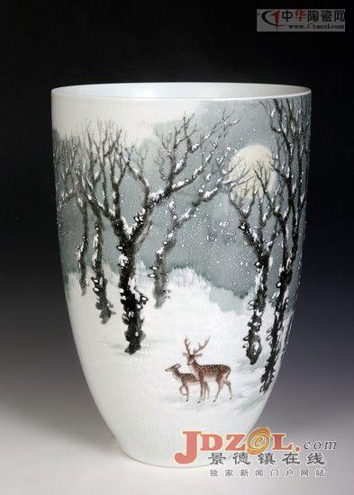 歐陽(yáng)敏作品 粉彩瓷瓶《雪霽鹿鳴》