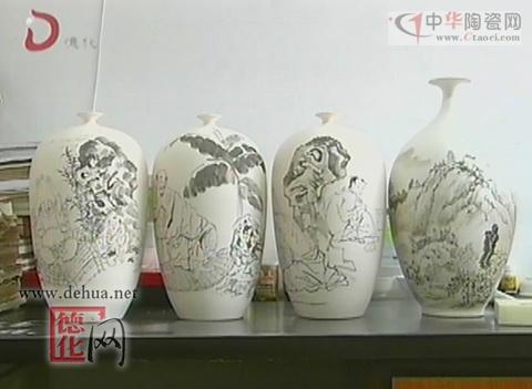 隨著手中畫筆在陶瓷坯體上的勾勾畫畫、起起落落,一幅意境幽遠(yuǎn)的山水畫,在省人大書畫院副院長王奇志的妙筆中漸漸呈現(xiàn)在潔白的陶瓷坯體上,山水花鳥布局合理、層次分明,大自然的靜謐神奇慢慢流淌開來?沙醮卧谔沾膳黧w上作畫的他,比在宣紙上作畫還是顯得有些不習(xí)慣。
