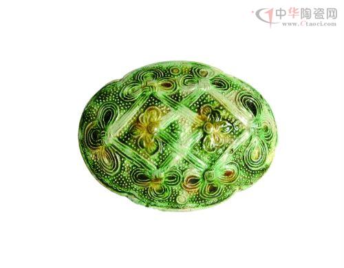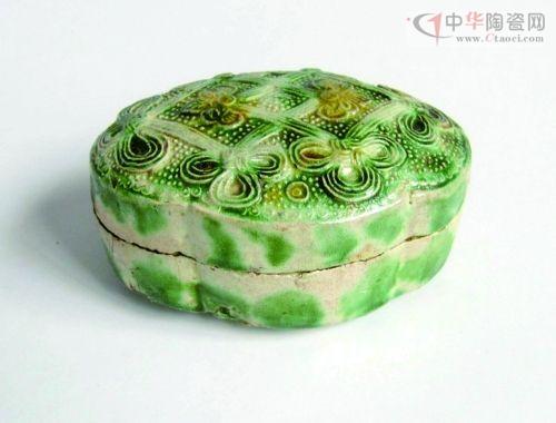 解說:這件三彩印花盒呈四瓣海棠花式,四角內(nèi)凹,上下對稱,子母口扣合,蓋頂珍珠地上凸模印如意結(jié)花紋。細白胎,胎體輕薄,做工精細、小巧。釉色白中點飾綠、黃色釉,滿釉支燒。此盒造型清秀典雅,分色亮麗,印花裝飾簡樸、清晰,具有唐代金銀器的藝術(shù)效果,是此類粉盒中的精品。驗證了金銀器對于陶瓷器物的影響,其精致也給后世留下印花工藝的典范。