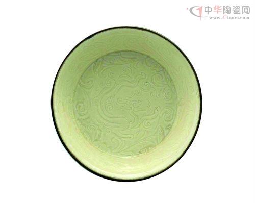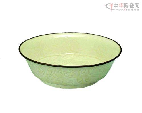 解說:此件藏品敞口、斜腹、圈足,近底處內(nèi)折。通體施牙白色釉,芒口覆燒,口部鑲銀。內(nèi)、外壁劃刻蓮花、蓮葉紋,碗心劃刻螭龍紋,螭龍紋刻劃矯健生動,刀工遒勁有力,線條自然清晰,為定窯的上乘佳作?袒ㄊ撬未餍械囊环N陶瓷裝飾技法,北宋定窯刻花以其線條纖細流暢、刀法嫻熟精湛而為宋代刻花之冠;y輪廓線的一側(cè)呈單線,另一側(cè)呈雙線,雙線由外粗內(nèi)細的線條組成,這種以復合線組成的刻花是定窯刻花器的一大特征。