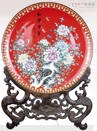 掛盤,是平時(shí)生活中常見(jiàn)的盤子,在經(jīng)過(guò)藝術(shù)加工后,形成的一種極具有觀賞性的工藝裝飾品,俗稱“藝術(shù)盤子”。此款琺瑯彩掛盤上飾“九蝶九花”, 以九九歸一,盛喻四海同心的中華盛世,再加上“中國(guó)紅”地的明亮色澤,讓這幅“和諧中華”圖更顯喜慶祥和。