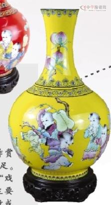 玉堂春瓶為雍正時(shí)期新出現(xiàn)的一種造型,作賞賜之用。撇口,細(xì)長(zhǎng)頸,肩部裝飾凸弦紋,圓腹,圈足。瓶上所繪嬰戲圖即描繪兒童游戲時(shí)的畫作,又稱“戲嬰圖”,是中國(guó)人物畫的一種。嬰戲圖以小孩為主要繪畫對(duì)象,以表現(xiàn)童真為主要目的,畫面上的兒童或玩耍,或嬉戲,千姿百態(tài),妙趣橫生。還有和生肖圖案、各種吉祥器物、兒童游戲結(jié)合的。嬰戲圖最早出現(xiàn)在唐代長(zhǎng)沙窯瓷器上,明清時(shí)期達(dá)到鼎盛。嬰戲圖中孩童純真可愛(ài)的形象,特別能表現(xiàn)節(jié)慶歡樂(lè)的氣氛,有祈福求安的意義,也是百子千孫、多子多福的好兆頭。