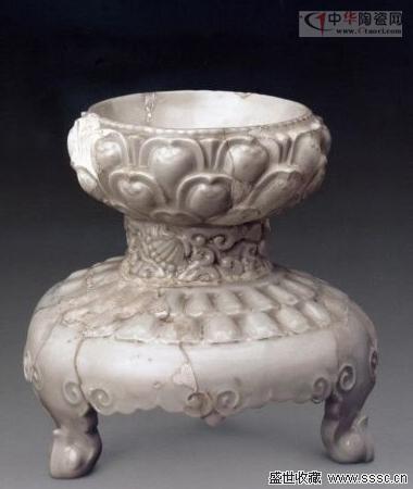 永樂白釉浮雕蓮瓣紋束腰三足座 高19.3厘米 1983年景德鎮(zhèn)珠山御窯廠出土。