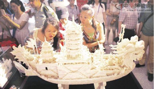 湖北展廳里,讓觀眾最感到神奇的莫過于仙桃的貝雕。這種手工藝的原材料是淡水貝殼,主要產(chǎn)自仙桃的沙湖。一件長近1米的龍船通體雪白,好像會發(fā)光,表面由很多的小方格粘結而成,但船面平整、做工細膩,傳承人徐銀枝說,“這一臺做起來要用半年,需要先把弧形的貝殼磨平,磨成各種形狀,再往一起拼接”,最難的部分就是比較細小部分的雕刻,力道的掌握要很準,只見龍船上房屋的鏤空花樣板由數(shù)不清的小格子組成,格子小的連大點的螞蟻都過不了。