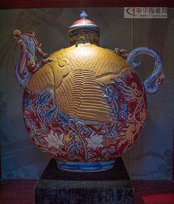 被譽(yù)為展覽上的“壺王”的這件高達(dá)50厘米的元代鳳紋扁壺,雕刻精美,壺身上同時(shí)施用黃釉、青花釉、釉里紅、青白釉等4種釉色,在現(xiàn)今發(fā)現(xiàn)的元代瓷器中所罕見
