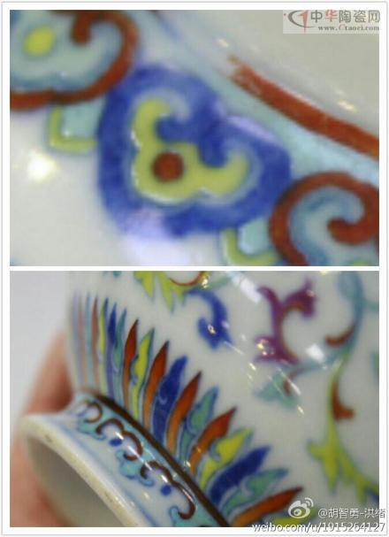 胡志勇撰文說:“一,罐口沿紅彩的幾處脫落是否脫落的自然?二,紅色為什么是油彩而不是水彩工藝?三,此罐屬于重工斗粉彩工藝,那為什么八寶之一寶瓶,瓶身整體只斗一色綠,而腹部中紋樣不見用其它色繼續(xù)渲染,這是否符合乾隆時(shí)期不厭其煩的工藝特征?