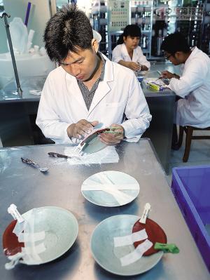 6月5日,海南省博物館出水文物保護修復實驗室內(nèi),科研人員在修復華光礁出水的瓷碗。