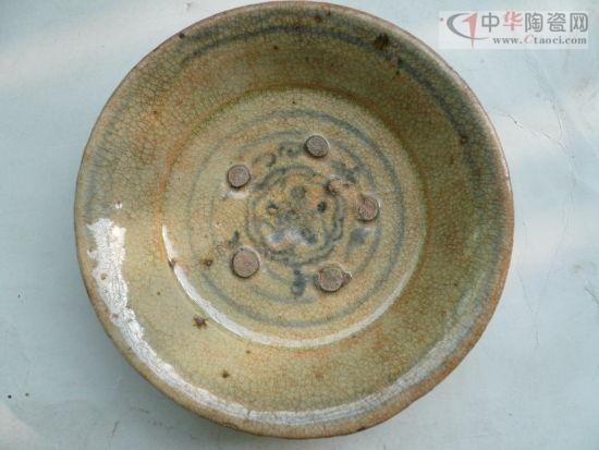 石廠窯青瓷胎土有白、灰白、灰黃等,均使用一種本地叫“觀音土”的瓷土,只是陶洗的精細(xì)程度不同而已。石廠瓷釉色有青黃、青灰、青綠數(shù)種,另有少量黑瓷。器型以碗為大宗,另有各型折腰盤、高足杯、茶臼等。青瓷釉色又有兩種,一種顏色偏綠,呈玻璃光澤,與中原青瓷相比毫不遜色,另一種顏色偏灰,亞光(圖1、2、3)。青瓷以素面為主,但部分碗底有印花裝飾。石廠窯使用龍窯燒制,慢輪手工拉坯,碗盤之間使用泥丸支燒,青瓷、黑瓷同窯燒制。