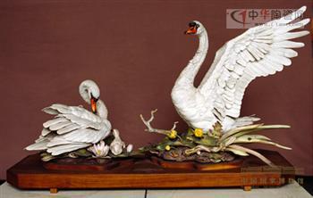 這件藝術(shù)品是由美國新澤西州波姆陶瓷藝術(shù)中心燒制。該中心的創(chuàng)始人愛德華?馬歇爾?波姆,是美國著名生物學(xué)家和鳴禽硬瓷燒制大師。他畢生踏遍歐美著名山林,悉心觀察鳥類的棲息動(dòng)態(tài)和習(xí)性,創(chuàng)作了大量飛禽藝術(shù)作品。瓷塑天鵝是其晚年的杰作之一。作者成功地把天鵝繁衍、哺育和愛撫后代的生態(tài)本能,塑造得維妙維肖。作品大小天鵝、水草、魚蟲,無不栩栩如生,盎然成趣,是一件塑、雕、色結(jié)合得十分縝密、和諧的藝術(shù)品。