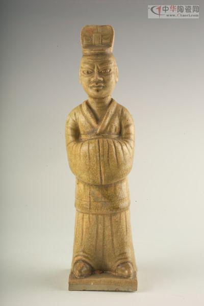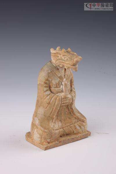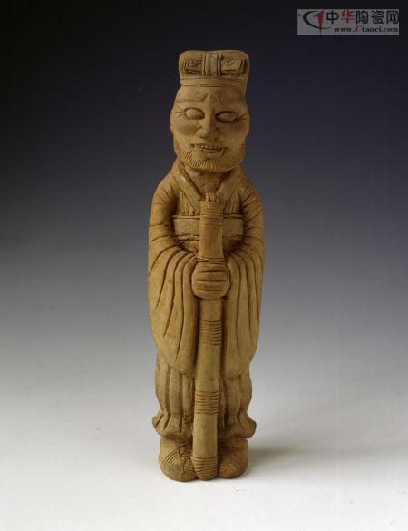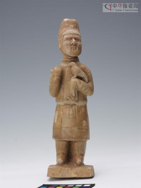 1972年出土于湘陰縣城南公社隋大業(yè)六年墓葬中,是一件不可多得的有準(zhǔn)確紀(jì)年的隋代胡俑。該俑為陶質(zhì),高27厘米,濃眉大眼,高鼻,絡(luò)腮胡須,綰發(fā)小冠,上身著寬袖開襟衣服,胸前系帶,下穿百褶褲,褲筒碩大,系有繩帶,雙手持杖立于身前,腳穿草鞋。