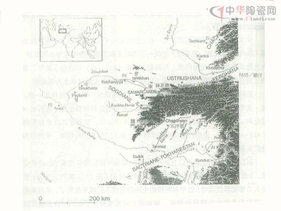 從岳州窯燒造胡人俑的外貌和裝束來看,均是來自西域的胡人。當(dāng)時(shí)來自西域的胡人主要是沿著絲綢之路而來的粟特人、波斯人、大食人(阿拉伯人)。粟特人是居住在中亞拉姆河與錫爾河之間的澤拉夫善河流域(今烏茲別克斯坦)(圖12)的半農(nóng)半商民族,建有康國(guó)、安國(guó)、米國(guó)、史國(guó)、曹國(guó)、何國(guó)等城邦國(guó)家。該民族善于經(jīng)商,利之所在,無所不到,男子年二十,便遠(yuǎn)赴他國(guó),四處經(jīng)營(yíng)。他們正是以通商的方式叩開了往返于中華的大門。粟特人是個(gè)有意思的民族,有著自己的宗教信仰和獨(dú)特習(xí)俗。在宗教方面,他們信仰火祆教。在婚姻上,可以“納母及姊妹為妻”。在喪葬制度上,火祆教經(jīng)典《阿維斯陀經(jīng)》規(guī)定,人死后,其尸體讓狗噬鳥啄;《西蕃記》記載:康國(guó)在城外,“別筑一院,院內(nèi)養(yǎng)狗。每有人死,即往取尸,置此院內(nèi),令狗食人肉盡,收骸骨埋殯”。波斯人是生活在伊朗地區(qū)的古老民族,建立了薩珊王朝(226年~650年)。自古以來,波斯與我國(guó)友好往來,《魏書》記載,波斯使臣來中國(guó)交聘達(dá)數(shù)十次之多,給北魏皇帝帶來的各種禮品中有各種珠寶、馴象等。薩珊王朝被阿拉伯帝國(guó)滅后,大部分波斯人伊斯蘭化,少量的波斯人來到唐土,如末代薩珊王朝國(guó)王的兒子俾路斯東逃至唐朝,在唐高宗時(shí)任右武衛(wèi)將軍。阿拉伯帝國(guó)滅掉波斯人和粟特人建立的政權(quán)后,完全控制了中亞地區(qū),成為與唐王朝經(jīng)濟(jì)文化往來的主要西域胡人。