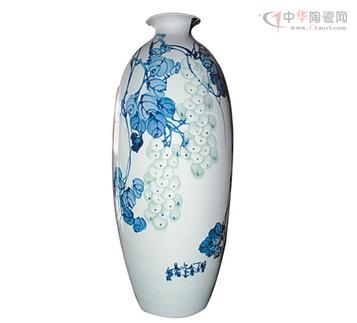 《碩果累累》花瓶器型:撇口,短頸,溜肩,肩以下漸收。運(yùn)用青花汾水與半刀泥綜合裝飾技法,增強(qiáng)了作品的整體美。主體畫面采用青花汾水技法,表現(xiàn)出枝葉的濃淡,正反與層次。在果實(shí)部分則用半刀泥技法,刻出果形,施以數(shù)層青釉,形成凹凸的立體感,使清香四溢像一串串綠寶石一樣的葡萄形象逼真、惟妙惟肖。整件作品,青白空間處理相宜,疏密之間安排有致,汾水層次豐富,明暗濃度變化自然。展現(xiàn)出一副春華秋實(shí)、果滿枝頭的絢麗景色。