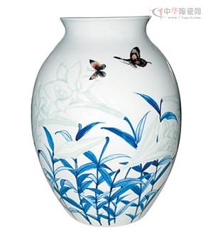 《百年好合》花瓶器型:撇口、溜肩、圓腹。采用半刀泥的裝飾技法突出百合花純潔、天真的形態(tài)。每莖一花,隱隱幽香。以青花勾繪出的葉莖形象簡練,線條剛勁有力,枝葉飄動(dòng),畫面無風(fēng),卻有輕風(fēng)拂面之感。三只蝴蝶用粉彩表現(xiàn)得栩栩如生。整體畫面淡雅清新,構(gòu)圖嚴(yán)謹(jǐn),將百年好合的寓意表現(xiàn)得極為突出。