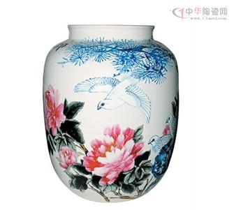 《富貴長青》花瓶器型:唇口,肩以下略收。作品器型渾厚大方,造型如燈籠,胎質(zhì)瑩潔無瑕。以釉下青花繪制松樹,用筆流轉(zhuǎn)有力,松枝處理極為飽滿舒逸。用釉上粉彩裝飾的牡丹從枝葉到花朵色彩淡雅,層次豐富,烘托出牡丹的富貴之氣。再結(jié)合半刀泥技法刻畫出生動(dòng)可愛的鴿子并以青花勾線,畫面寓意深刻、詼諧,相映成趣,體現(xiàn)了作者對青花等多種裝飾技法靈活多變的運(yùn)用能力!