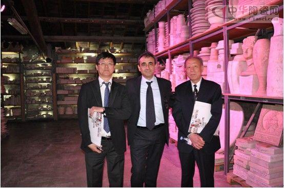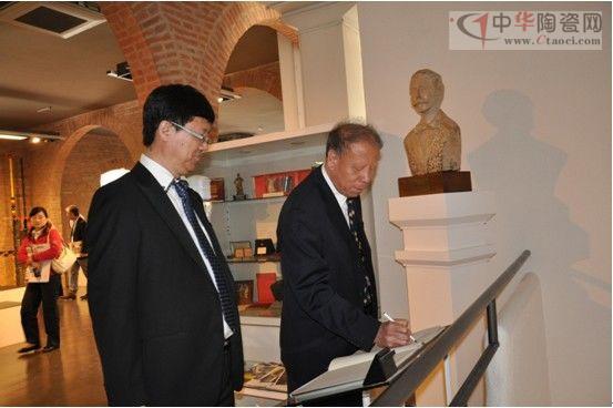 伊莫拉陶瓷集團主席斯蒂法諾?波羅涅思(中)帶領意大利蜜蜂瓷磚中國區(qū)總裁張有利(左)、中國建筑裝飾協(xié)會會長李秉仁(右)參觀伊莫拉陶瓷博物館