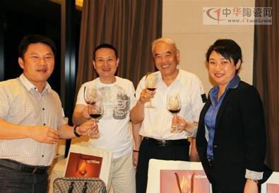 鷹牌陶瓷副總裁陳賢偉(左一)、建材周刊董事長(zhǎng)羅青(左二)、佛山市陶瓷行業(yè)協(xié)會(huì)副會(huì)長(zhǎng)黃希然(左三、)與陶瓷總部副總經(jīng)理湯潔明(左四)共同舉杯祝酒