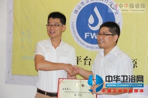 佛山市衛(wèi)浴潔具行業(yè)協(xié)會會長朱云鋒(右一)為奧爾氏總經(jīng)理劉文貴(右二)頒發(fā)聘書