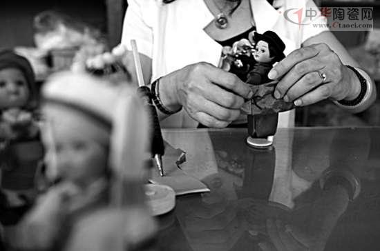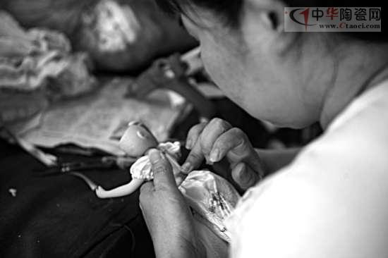 廣東潮州慶發(fā)陶瓷公司設(shè)計(jì)師邱楚芳在給陶瓷“布娃娃”穿上民族服飾。