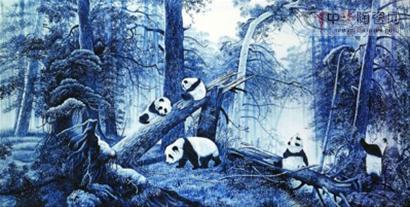 《歡樂家園》是一幅大尺寸的瓷板畫,畫面上是一片森林。巨木參天,五只可愛的熊貓寶寶神態(tài)各異,有的在打盹,有的在攀爬,有的在玩耍,有的在行走,快樂悠閑,這是一種作者的心境描寫,展示對生活的熱愛與追求。青花追求的是一種簡潔明快,而作者在整個畫面上滿滿當(dāng)當(dāng),很少留白,這就顯示了他的功力。在這幅畫面中,無論布局與構(gòu)圖,作者都能用豐富的層次來展現(xiàn)。同樣參天大樹,遠處是淡淡的,近處不惜濃墨;憨態(tài)可掬的熊貓,無論是動還是靜,生動活潑;特別在畫面的中央,透出幾縷陽光,讓人有種豁然開朗的感覺,不會因色彩的單一和畫面的紛繁而感到沉悶。